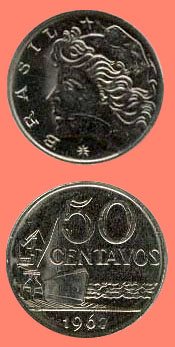 | 50 centavos cupro (75) -níquel (25) Anv: Figura feminina representando a republica, no exergo a rosa dos ventos - BRASIL * Rev: Valor 50 centavos e a data 1967, a esquerda industria naval. 50 centavos koper (75) -nikkel (25) Vz: Vrouwfiguur die de republiek Brazilië voorsteld, onder het hoofd de "rosa dos ventos" - BRASIL * Kz: Waarde 50 centavos en jaartal 1967, aan de linkerzijde een afbeelding van havenwerkzaamheden. 50 centavos copper (75) -nickel (25) Obv: A womans head representing the republic of Brazil, underneath the "rosa dos ventos" - BRAZIL* Rev: Value 50 centavos and date 1967,to the left a picture of shipping industrie. |