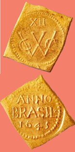 | 12 florins ouro Av: O valor XII (12 florins) e as letras GWC (Geoctroyeerde Westindische Compagnie) dentro colar de pérolas. Re: ANNO BRASIL' e a data dentro colar de pérolas. 12 gulden goud Vz: De waarde XII (12 gulden) met daar onder het monogram GWC van de Geoctroyeerde Westindische Compagnie. Kz: De tekst ANNO BRASIL met daar onder het jaartal. 12 florins gold Obv: The value XII (12 guilders) with the letters GWC, Geoctroyeerde Westindische Compagnie in a circle of pearls. Rev: The text ANNO BRASIL' and the date in a circle of pearls. |