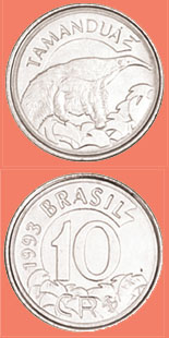 | 10 cruzeiros reais aco inoxidavel Anv: Figura de um tamanduá. Texto: TAMANDUÁ. Rev: Valor, data e dístico BRASIL. 10 cruzeiros reais roestvrij staal Vz: Afbeelding van een miereneter. Tekst: miereneter. Kz: Waarde, jaartal en de landsnaam BRAZILIE. 10 cruzeiros reais stainles steel Obv: Picture of an anteater. Text: anteater. Rev: Value, data and the countryname BRAZIL. |