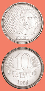 inoxidável Av: Efígie da República, dístico BRASIL e ramos de louro estilizados. Re: O valor 10 CENTAVOS, data e ramos de louro estilizados. 10 centavos roestvrij staal Vz: Gezicht van een vrouw, de republiek Brazilië voorstellende, daar onder de tekst: Brazilië. Kz: De waarde 10 CENTAVOS en het jaartal met aan weerszijden gestileerde lauwertakken. 10 centavos stainles steel Obv: The face of a woman representing the republic Brazil, underneath the text: Brazil. Rev: The value 10 CENTAVOS and the date between laurel branches. |